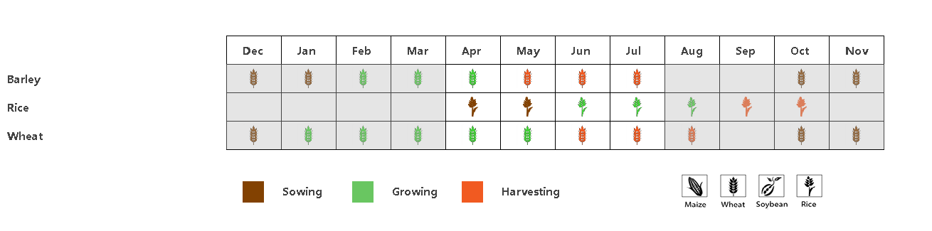 As shown on the penology map, the main crops in Syria include wheat and barley. During the current reporting period from April to July, both barley and wheat were in their respective grain filling stage, and reached maturity in May and June. The proportion of cropland (rain-fed and irrigated) in Syria is about 32.8% and regular rainfall is crucial for crop growth because of most of the cropland in Syria is rain-fed.