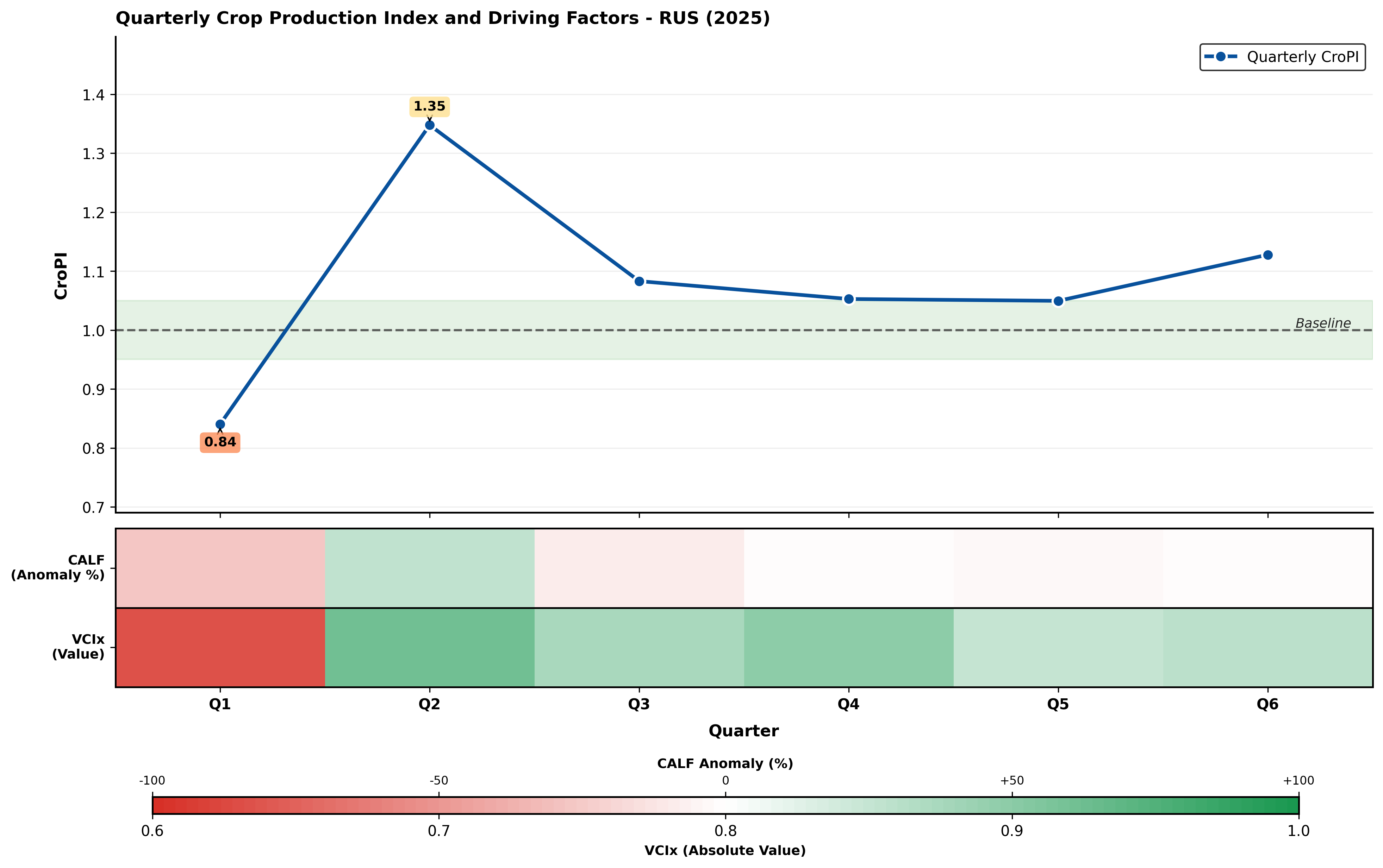 Agricultural production in Russia for 2025 was generally characterized by a "volatile start, mid-season pressure, and overall resilience." Throughout the annual growth cycle, the sowing and initial growth period for winter wheat (Q1: November 2024–January 2025) saw the Crop Production Index (CroPI) at a low level of 0.84 due to unfavorable conditions at the start of sowing. However, during the overwintering and green-up period (Q2: January–March), benefiting from a warmer-than-average winter (temperatures +1.35°C) and sufficient precipitation, CroPI jumped significantly to a high of 1.35, ensuring safe overwintering and a solid foundation for green-up. During spring sowing and early growth (Q3: March–May), meteorological conditions were generally stable, and CroPI settled back to 1.08, though the Cropped Arable Land Fraction (CALF) began to show regional declines. During the summer grain-filling and harvest period (Q4–Q5: May–September), influenced by precipitation deficits in southern major producing areas, CroPI stabilized at around 1.05. In the concluding phase of September–November 2025, although precipitation remained below normal (-16%), ample sunlight and temperatures close to the average resulted in potential cumulative biomass remaining near normal levels (-0.4%), and CroPI rose slightly to 1.13. The annual CroPI curve demonstrates that Russian agriculture possesses strong adaptability to localized adverse conditions following initial volatility (Figure 2.19).